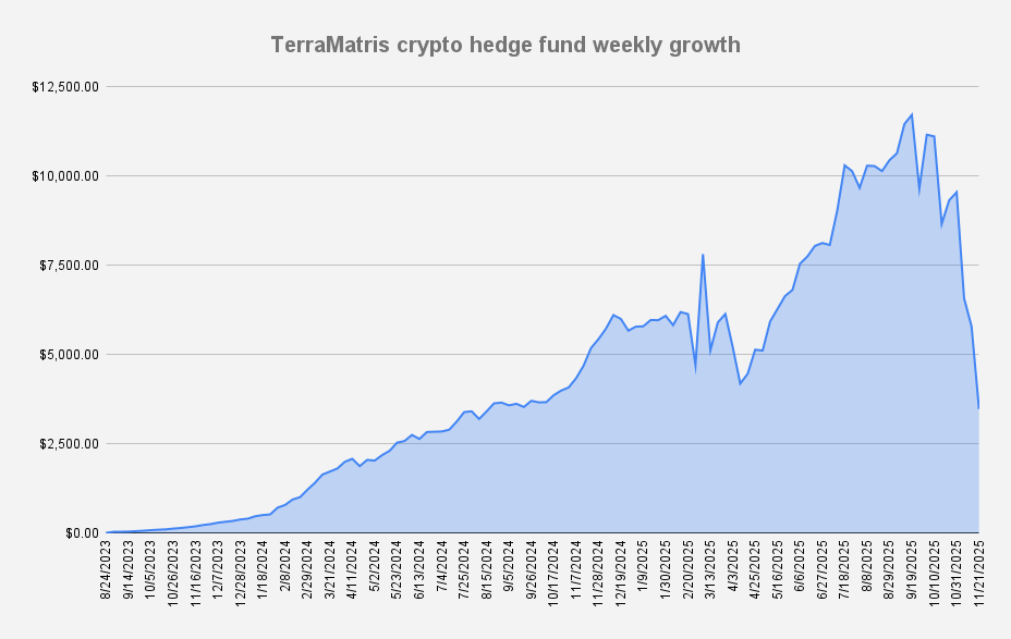 As of November 21, 2025, the TerraM Multi-Asset Crypto Options Fund is down –40.00% week-over-week, marking our worst weekly result to date. The overall drawdown has deepened to –70.35%, placing the fund firmly in distressed territory. The crypto bear market has hit us hard, and leverage remains the primary problem. Core positions are still intact, but another week of similar magnitude could put us at serious risk without additional external capital.