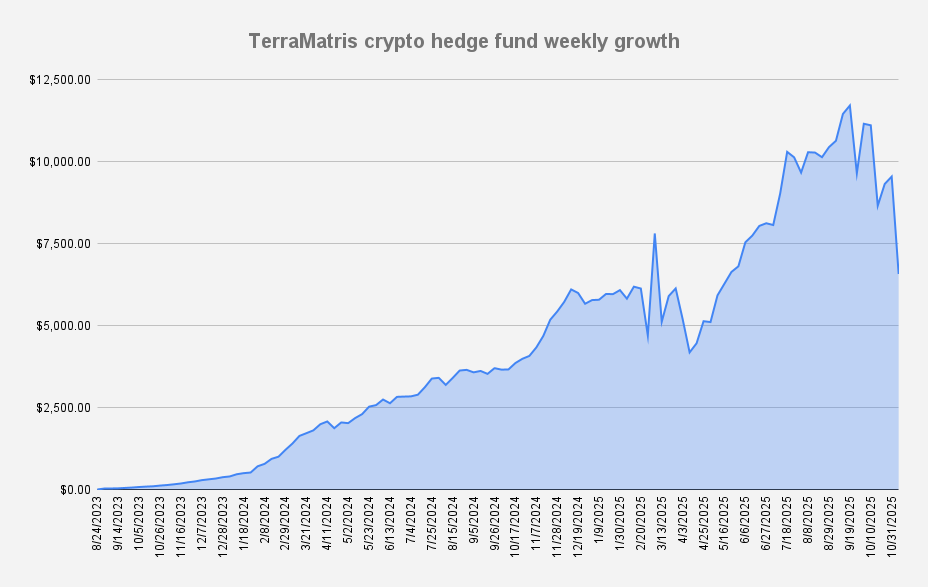 As of November 7, 2025, the value of the TerraM Multi-Asset Crypto Options Fund has declined by -31.12%. While this may appear to be our worst week-over-week result, it is not unprecedented — on March 13, 2025, the fund experienced an even steeper drop of -34%.