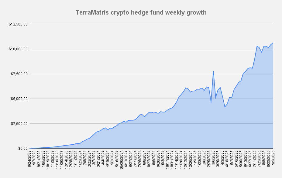 As of September 5, 2025, the Terramatris crypto hedge fund value stood at $10,643 what is an increase of +1.86% or +$194 in dollar terms when compared to the last week. Also we have set another all time high. Awesome!
