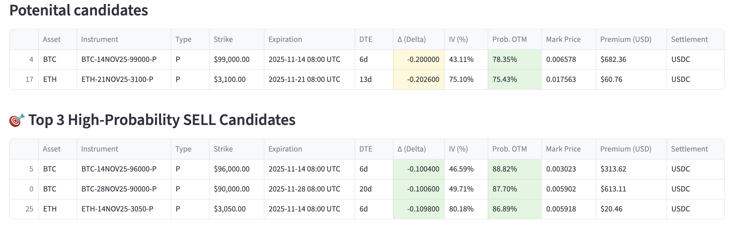 We focus only on short-premium strategies — selling puts and covered calls — that align with our conservative, income-oriented approach. All probabilities are derived from real-time Deribit option data; values such as delta, IV, and mark price are included for reference.