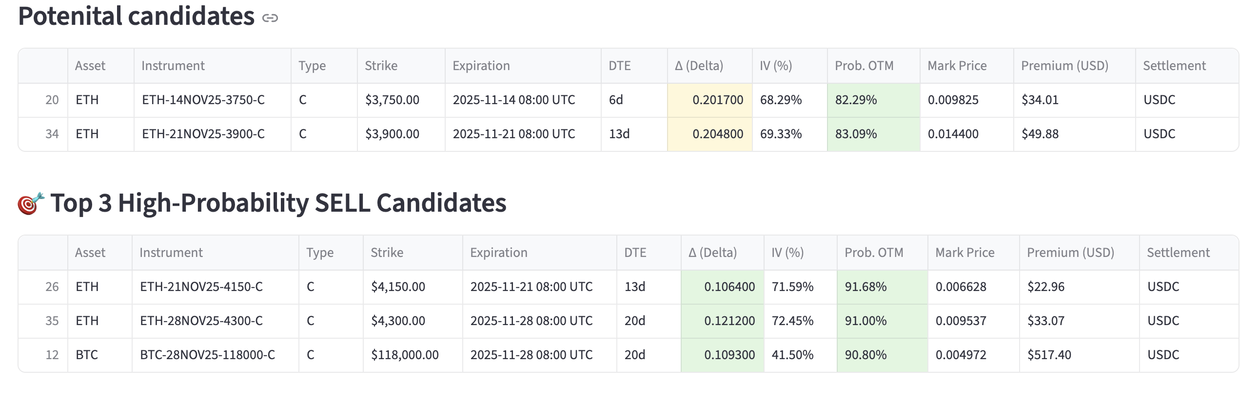 Each week, our screening engine evaluates crypto options across BTC, ETH, and selected altcoins to identify premium-selling setups with favorable risk-to-reward and a statistically high chance of expiring worthless.