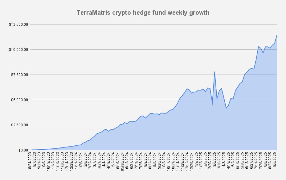 As of September 12, 2025, the Terramatris crypto hedge fund value stood at $11,461 what is an increase of +7.69% or +$818 in dollar terms when compared to the last week. Absolutely brilliant!