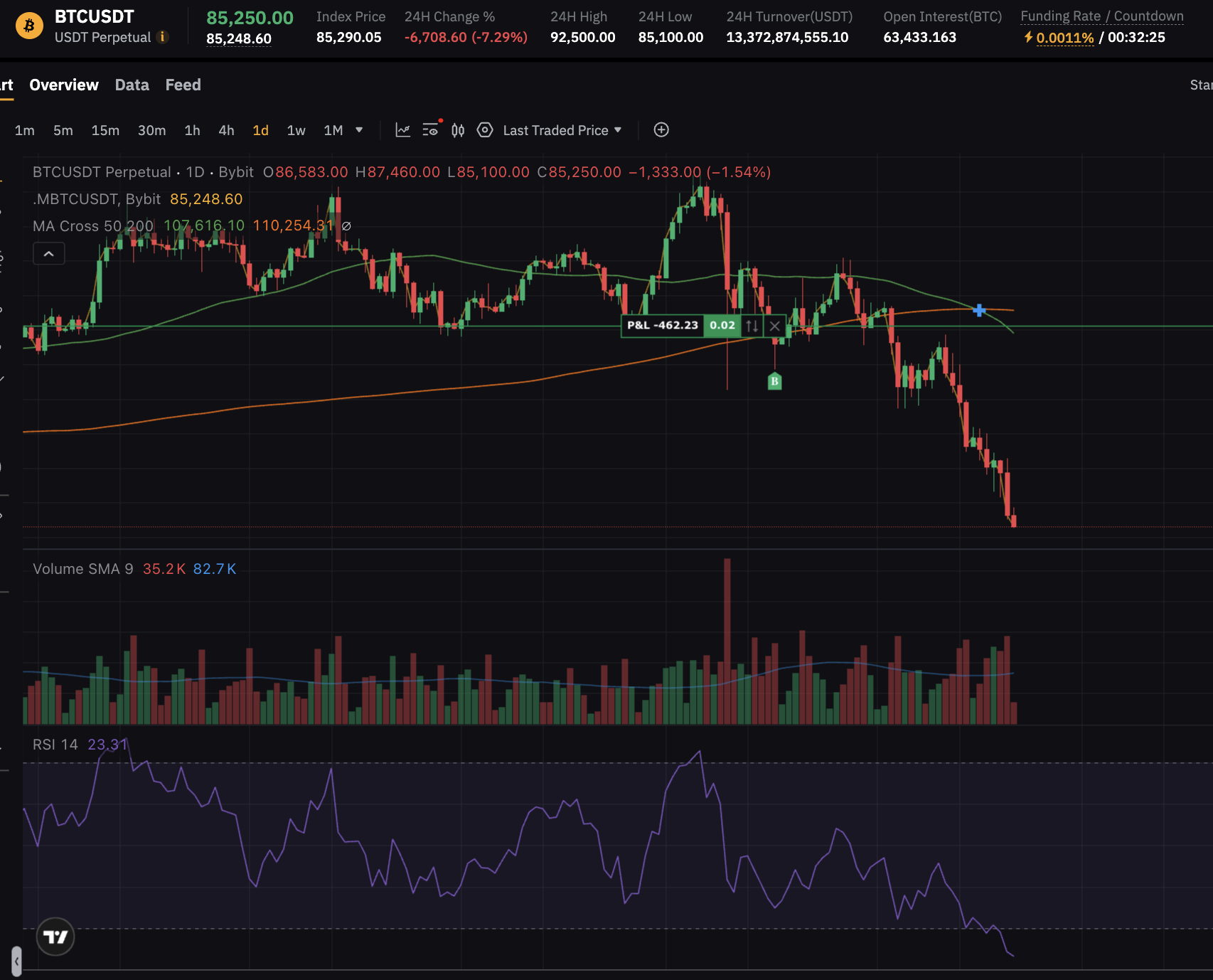 Bitcoin is clearly oversold. It’s trading below both its 50- and 200-day moving averages, and a death cross has already occurred. The RSI is deep in oversold territory. A further decline is still possible, but from a technical standpoint, a bounce (even if short-lived) is likely.