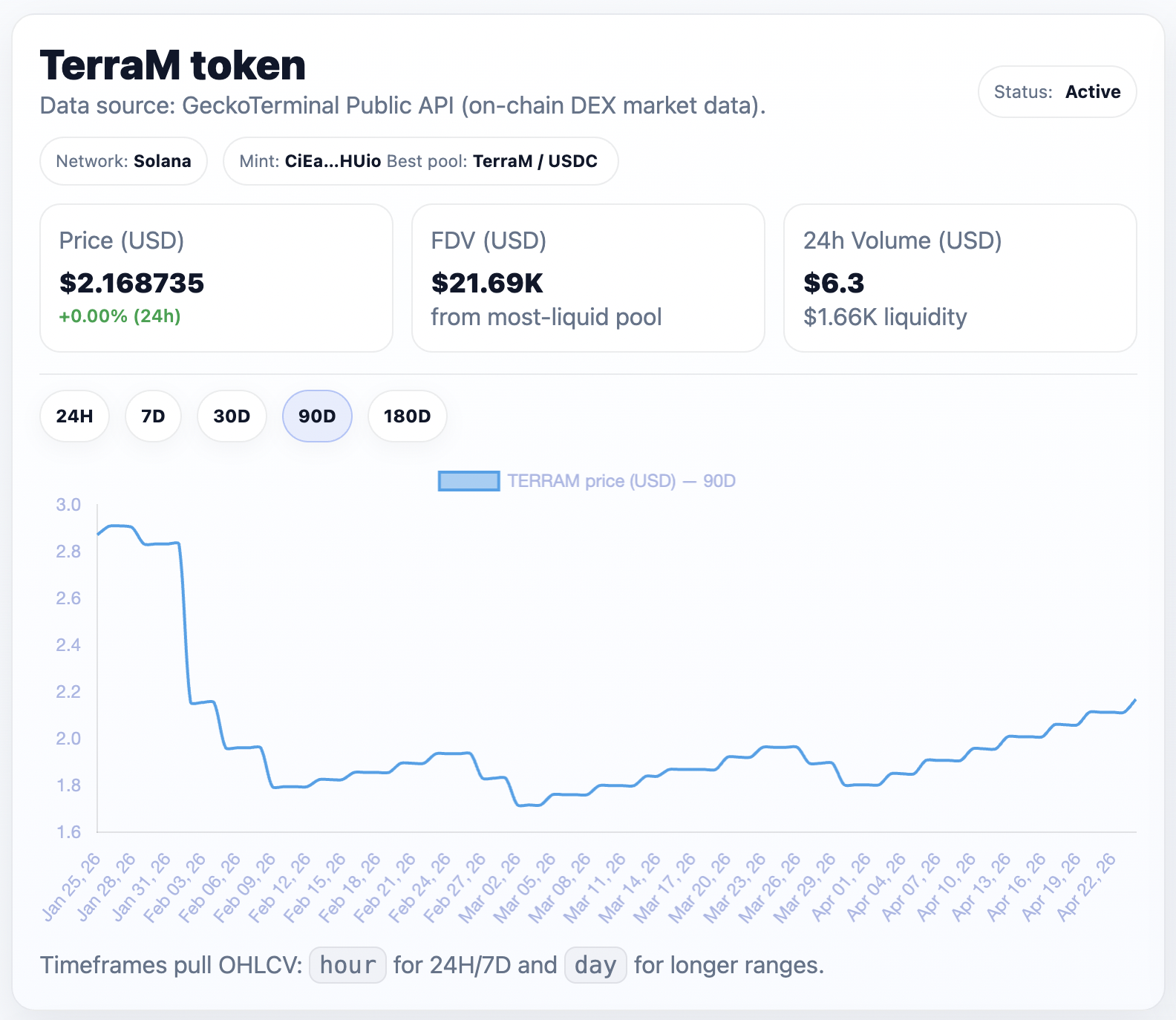 On April 24, 2026, the TerraM token traded at $2.16, up +5.36% week over week. On-chain activity was minimal, with two buys and no sells. The token has moved comfortably above $2 and we expect it staying so, unless some black swan event happens.